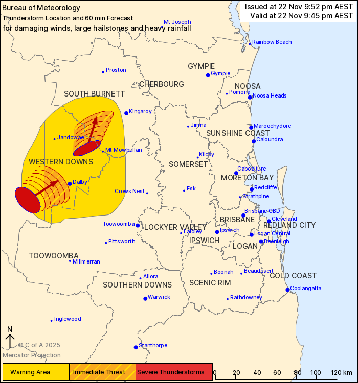 The Bureau of Meteorology warns that, at 9:45 pm, severe