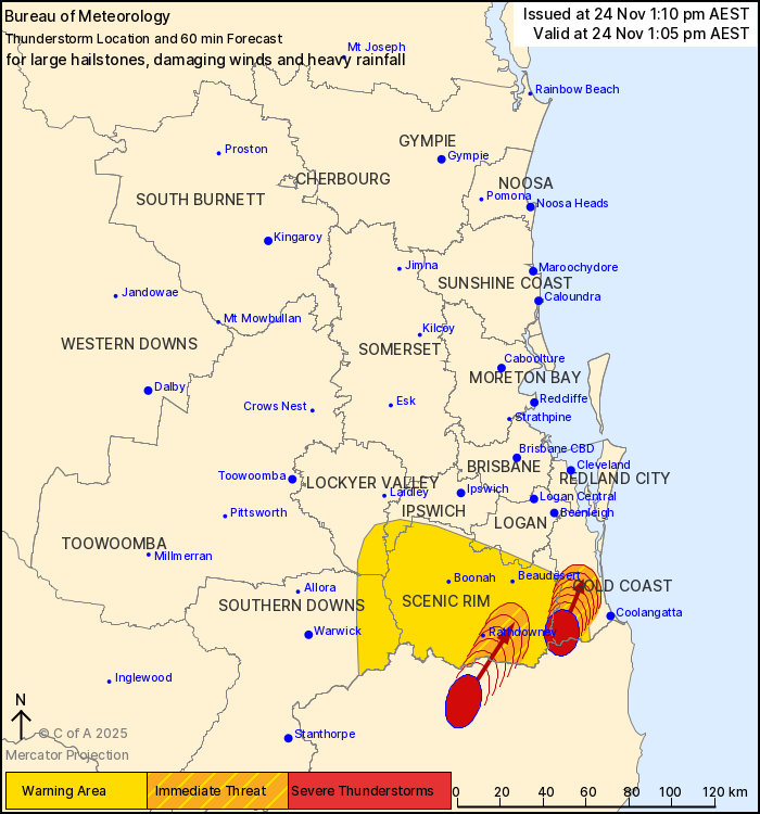 The Bureau of Meteorology warns that, at 1:05 pm, severe