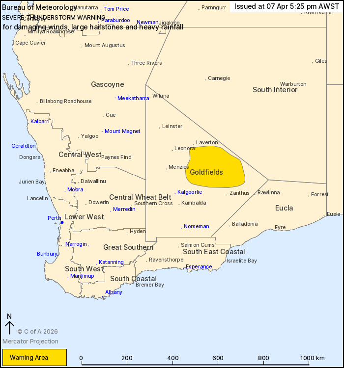 Severe thunderstorms over parts of the Goldfields.